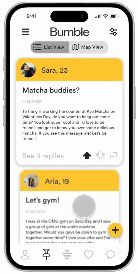This conceptual feature for the popular online dating platform Bumble allows users to create postings that pinpoint the location of a brief interaction with someone they want to get in contact with. Inspired by the “Missed Connection” Instagram accounts created for college campuses. Using real-time location tracking, users can view postings on an interactive map or in the form of a feed with community monitoring features. Premium users have access to advanced features such as an unlimited feed and viewing/replying to posts.